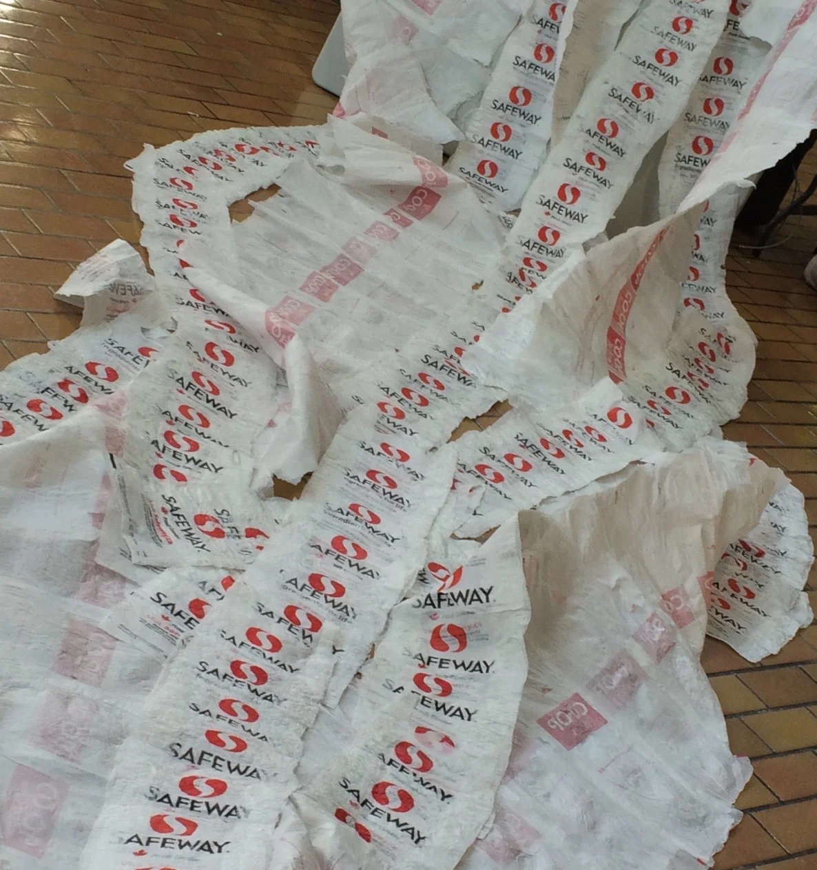 At first I was interested in bags as a raw material – what could I do artistically with them while keeping them out of a landfill. I discovered fusing techniques using an iron and was off to the races experimenting. That fall of 2015, I was in residence at the Alberta College of Art and Design. Prior to my arrival, a call went out to the community to bring in bags. I was nervous that none would materialize, so I shipped myself a box of bags that I’d collected over the years. Within days of my arrival, and much to my dismay, thousands upon thousands of bags had appeared. Safeway, a grocery chain in Canada, were the most plentiful. The irony of which was not missed; plastic bags are not a safe way for the future of the environment. The visual impact of so many bags made an impression and became the focus of conversations, with many individuals remarking that they were going to begin to bring their own bags to the supermarket.